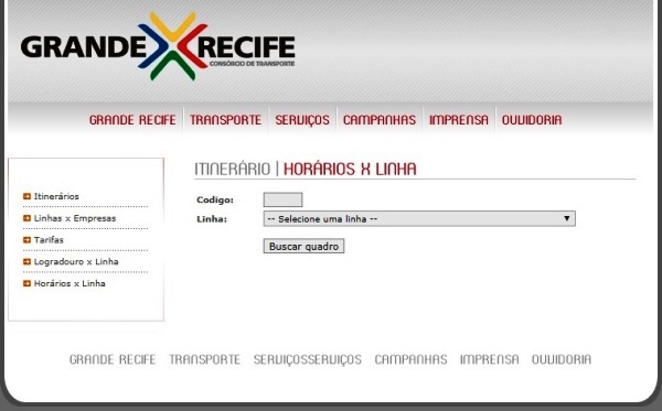 Já está disponível no site do Grande Recife Consórcio de Transporte uma nova ferramenta de informação sobre as linhas do Sistema de Transporte Público de Passageiros da Região Metropolitana do Recife (STPP/RMR). Trata-se de um link especial contendo todos os horários dos ônibus das 383 linhas atuantes na RMR. O serviço também disponibiliza aos usuários os atendimentos realizados pelos veículos com plataforma elevatória.