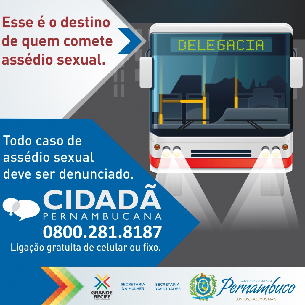 Os ônibus que compõem a frota do Sistema de Transporte Público de Passageiros do Grande Recife Consórcio de Transporte começaram a circular com cartazes alertando a população sobre o assédio sexual no transporte público. Três mil cartazes estão sendo fixados nos coletivos e terminais até o dia 14 de setembro. O material também será distribuído em escolas, empresas públicas e privadas para sensibilizar a sociedade de forma preventiva sobre um crime de grande ocorrência nesses espaços.