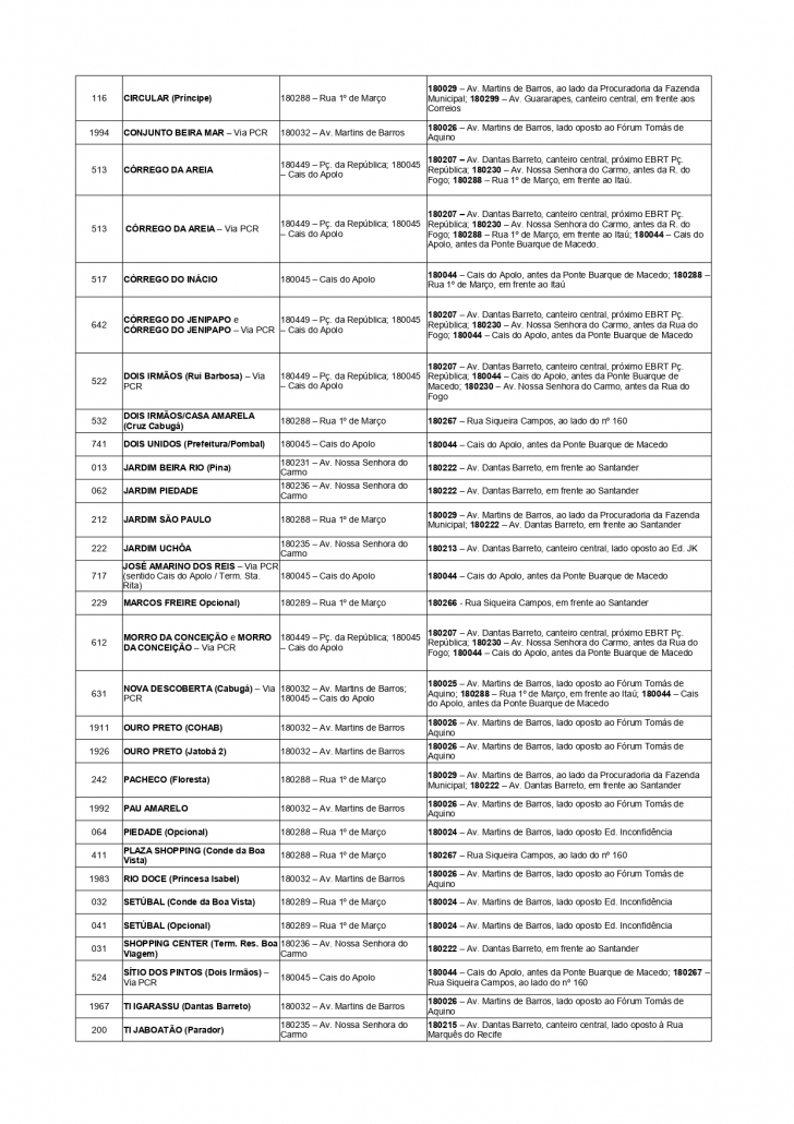 Obs: nesta parada já para normalmente as linhas: 018 – BRASÍLIA TEIMOSA, 121 – VILA DA SUDENE – VIA VILA PINHEIROS, 122 – VILA DO IPSEP, 168 – TI TANCREDO NEVES (CONDE DA BOA VISTA) – PCR, 212 – JARDIM SÃO PAULO, 242 – PACHECO (FLORESTA), 243 – VILA DOIS CARNEIROS – VIA AGAMENON MAGALHÃES, 331 – TOTÓ (JARDIM PLANALTO), 414 – TORRE, 4123 – TRÊS CARNEIROS BAIXO (CAIS DE SANTA RITA), 4133 – TRÊS CARNEIROS (CAIS DE SANTA RITA), 4137 – UR-11 (CAIS DE SANTA RITA)