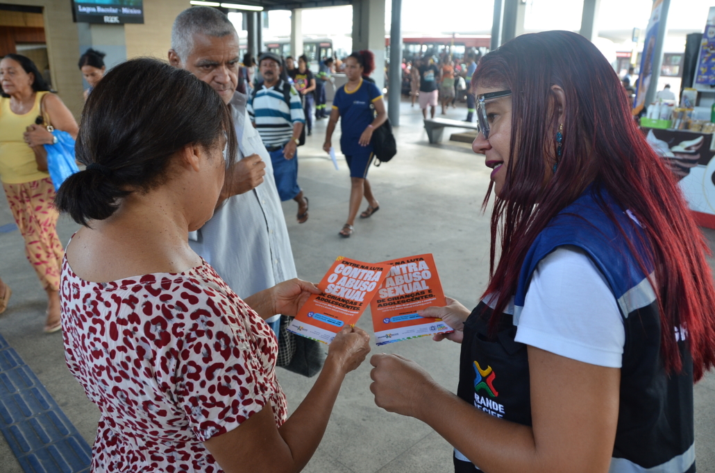 Instituída pela Lei Nº 14.432, de 3 de agosto de 2022, a campanha Maio Laranja tem como foco ações, em todo o território nacional, de combate ao abuso e à exploração sexual de crianças e adolescentes. O Governo do Estado, por meio da Secretaria de Infraestrutura e Mobilidade Urbana de Pernambuco – SEMOBI-PE/Grande Recife Consórcio de Transporte – CTM, realizou hoje (22), no Terminal Integrado Joana Bezerra, ação de panfletagem, quando técnicos de educação e fiscalização proferiram minipalestra visando mobilizar os usuários (pais e crianças) do Sistema de Transporte Público de Passageiros da Região Metropolitana do Recife – STPP/RMR, para que todas as vezes em que a população constatar esse crime, denuncie, além de alertar os pais para que tenham mais atenção em relação a essa prática criminosa.