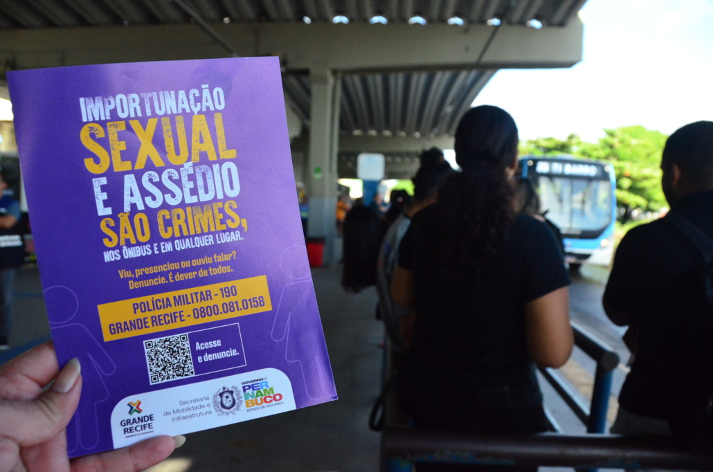 O Grande Recife Consórcio de Transporte – CTM, com objetivo de alertar a população sobre como identificar se sofrer importunação sexual dentro ônibus ou perceber alguém sendo vítima deste tipo de abuso, realizou hoje (12), no Terminal Integrado Cajueiro Seco, localizado em Jaboatão dos Guararapes, ação educativa com foco na denúncia desta prática criminosa nos números da Polícia Militar – 190, ou do Grande Recife – 0800.081.0158. Praticar contra alguém e sem a sua anuência ato libidinoso com o objetivo de satisfazer a própria luxúria ou a de terceiro, é considerado importunação sexual, com pena de reclusão de 1 (um) a 5 (cinco) anos, previsto na Lei nº 13.718, de 2018.