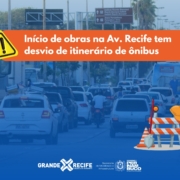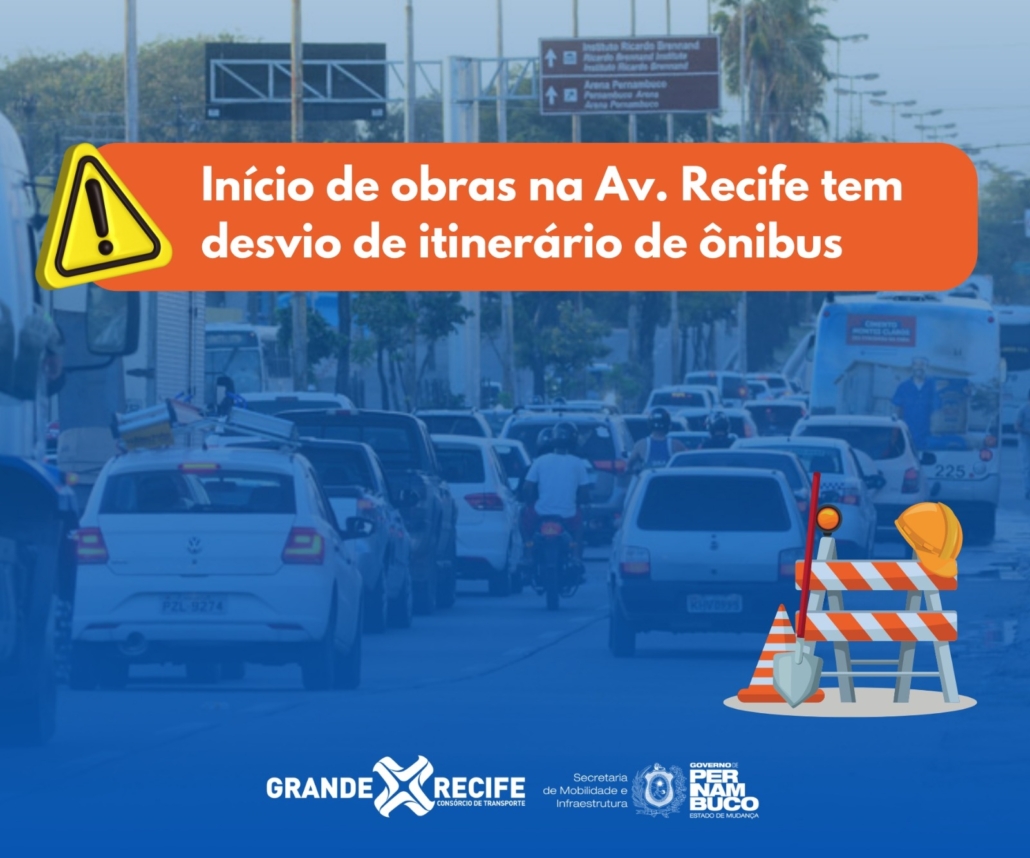 Em virtude de interdição total na Avenida Recife, no trecho compreendido entre a Rua Cap. Estevão Fernandes até a Av. Ten Felipe Bandeira de Melo, bairro de Areias, em decorrência de obras de drenagem realizadas pela Autarquia de Manutenção e Limpeza Urbana do Recife – Emlurb, o Grande Recife Consórcio de Transporte – CTM, que teve início ontem (08), com período de conclusão previsto para 30 dias, as linhas 102 – TI Santa Luzia/Ibura, 106 – TI Santa Luzia/Parque Aeronáutica (Jiquiá), 360 – Totó/Boa Viagem, 2040 – CDU/Boa Viagem/Caxangá e 060/2060 – TI Tancredo Neves/TI Macaxeira, estão com desvio de itinerário pela Avenida Recife, Rua Cap. Estevão Fernandes, Rua Gen. Francisco Figueiroa, Av. Ten. Felipe Bandeira de Melo, Avenida Recife.