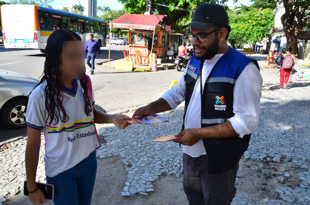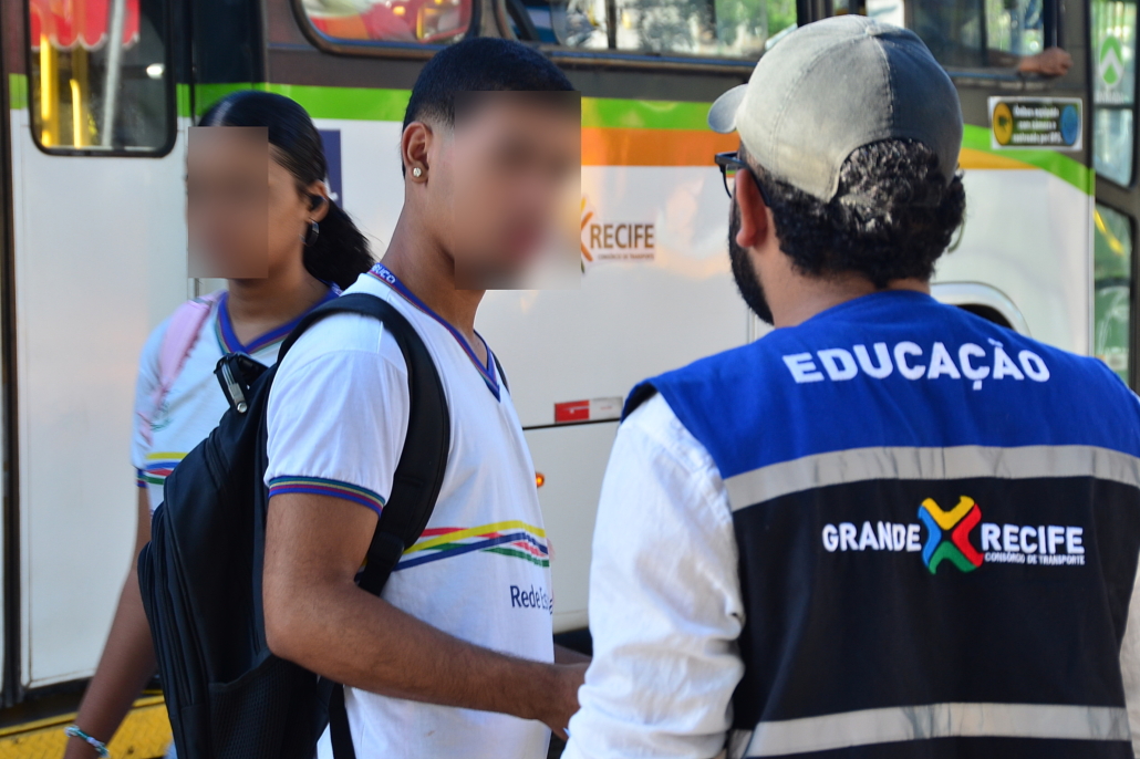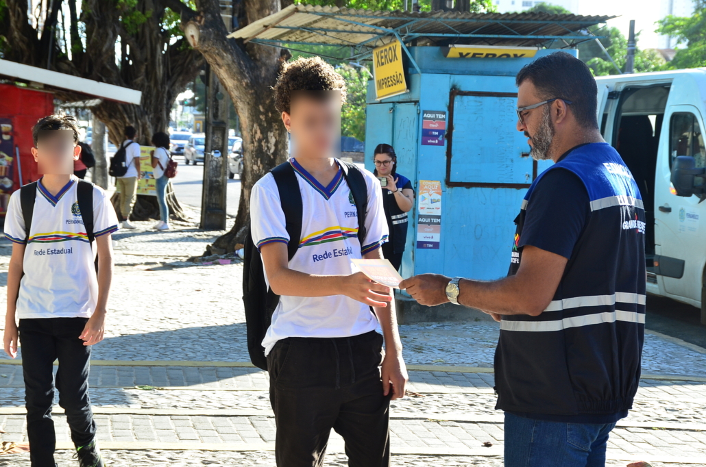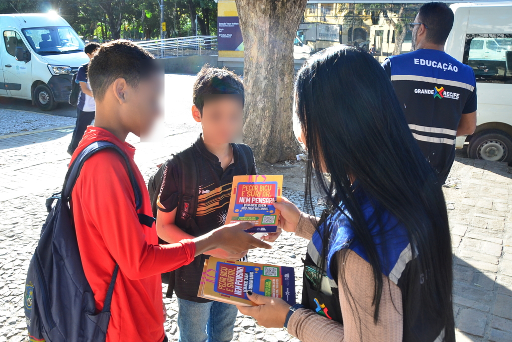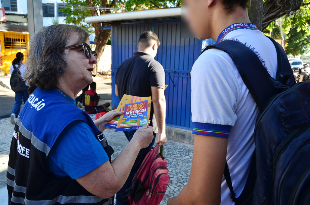 Com o início das aulas do segundo semestre de 2024, o Grande Recife Consórcio de Transporte – CTM, em parceria com a Secretaria de Educação, dando continuidade a campanha “Pegar Bigu e Surfar, nem pensar”, com objetivo de combater o aumento que vem ocorrendo da prática criminosa de “surf” e “amorcegamento” nos ônibus da Região Metropolitana do Recife – RMR, principalmente entre os jovens, realizou ação na frente da Escola Estadual João Barbalho (entrada dos alunos) e na Escola Vila dos Milagres (saída dos alunos), quando técnicos de educação e fiscalização realizaram panfletagem e proferiram mini palestra, alertando sobre os riscos que correm com a prática de se pendurar do lado de fora ou no teto do ônibus.