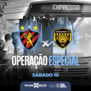 A partida campeonato Brasileiro de Futebol 2024 entre Sport X Amazonas, no próximo sábado (10), que vai acontecer na Arena de Pernambuco, às 17h, contará com operação especial de ônibus do Grande Recife Consórcio de Transporte (CTM). A linha 047 – TI Cosme e Damião/Arena será ativada a partir das 13h e a tarifa será a do Bilhete Único (anel A: R$4,10). O Grande Recife orienta que o torcedor antes de embarcar no ônibus, no Terminal Integrado Cosme e Damião indo para a Arena de Pernambuco, adquira antecipadamente sua pulseira, utilizando seu cartão VEM ou pagando em dinheiro, para garantir o acesso gratuito ao ônibus após o jogo, no retorno para o terminal integrado. Por se tratar de serviço eventual não haverá gratuidade ou abatimento tarifário. Ao torcedor sugerimos utilizar o transporte público de passageiros, devendo ir para o TI Cosme e Damião utilizando o Metrô e lá embarcar na linha de ônibus com destino a Arena de Pernambuco. Toda a operação será monitorada por fiscais do Grande Recife e, sendo necessário, o reforço e ajustes nos intervalos entre um ônibus e outro e no fim do jogo, eles serão realizados.