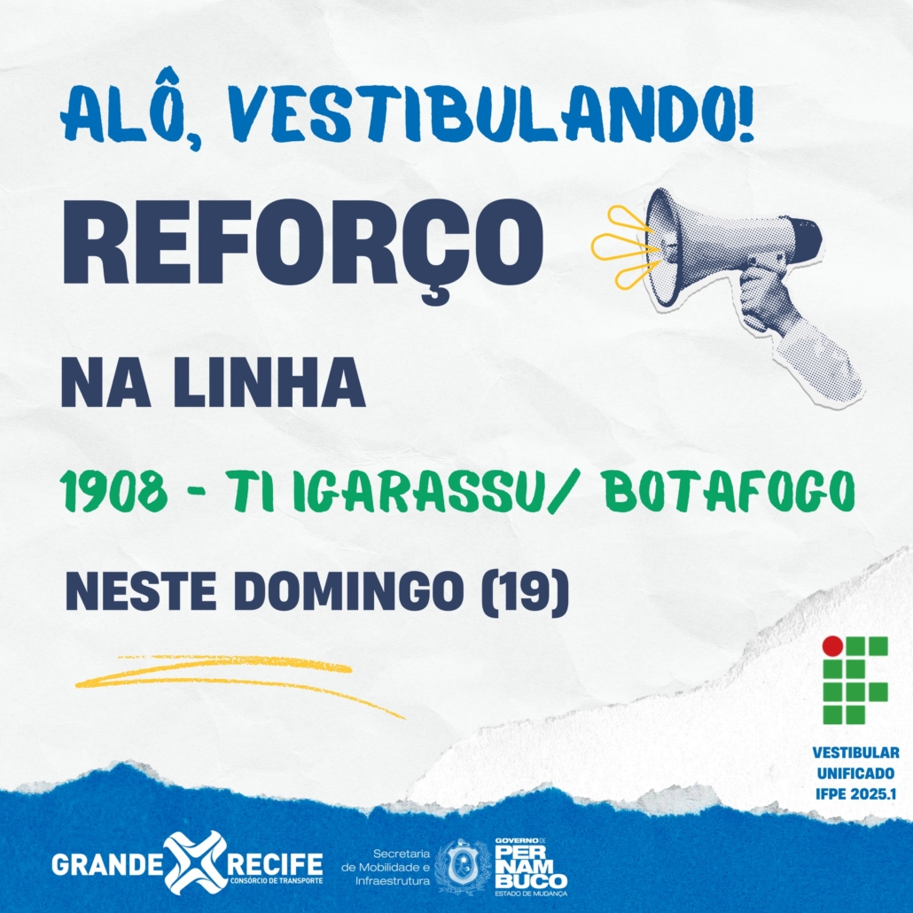 Com objetivo de ofertar melhor locomoção aos locais dos exames, o Consórcio de Transporte Metropolitano – CTM, vai realizar reforço na frota da linha 1908 – TI Igarassu/Botafogo, para os estudantes que realizarão o vestibular unificado do Instituto Federal de Educação Ciência e Tecnologia de Pernambuco – IFPE, Campus Igarassu, que acontecerá no próximo domingo (19), no horário da manhã.