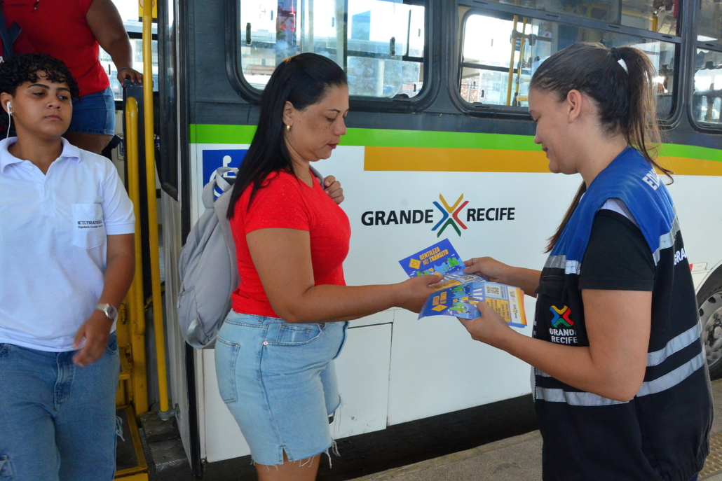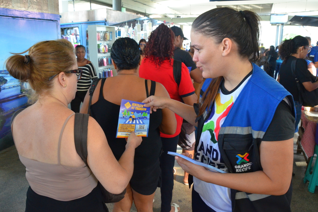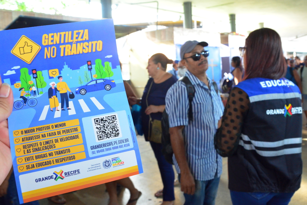 Encerrando as atividades da Semana Nacional de Trânsito 2025, que esse ano teve como tema “Desacelere. Seu bem maior é a vida”, o Consórcio de Transporte Metropolitano (CTM) realizou, hoje (25), no TI Joana Bezerra, a campanha ”Gentileza no trânsito”, reforçando a importância da convivência respeitosa no Sistema de Transporte Público de Passageiros da Região Metropolitana do Recife (STPP/RMR), que diariamente transporta milhares de pessoas.