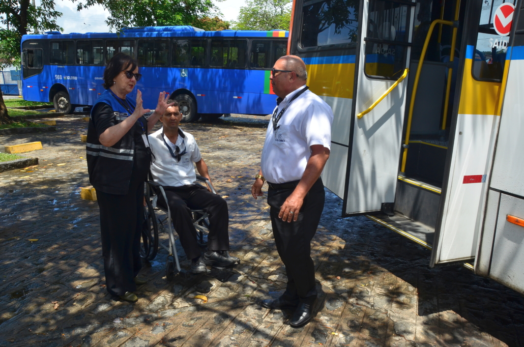 No local, destacando as medidas que devem ser adotadas para garantir a acessibilidade nos ônibus, os gerentes Kathia Sena (Fiscalização) e Heron Farias (Terminais), em uma conversa dinâmica com os motoristas, abordaram temas como a utilização correta da Plataforma Elevatória Veicular (PEV), os assentos preferenciais, balaústres, cintos de segurança para cadeirantes, condições da lapela, guarda-corpo para cadeira de rodas, cigarra e a comunicação visual voltada à acessibilidade.