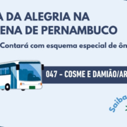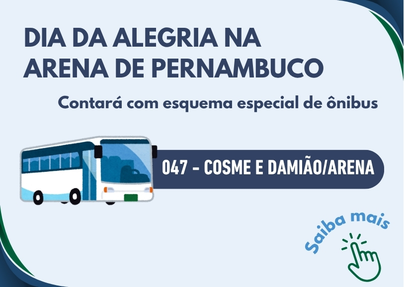 Para que ninguém fique de fora da festa, o Consórcio de Transporte Metropolitano – CTM, disponibilizará uma linha especial 047 – Cosme e Damião/Arena para o deslocamento da população do TI Cosme e Damião até a Arena. A operação tem início às 8h e encerramento às 22h, do dia 11/10.