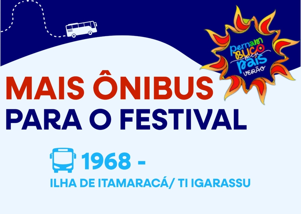 O Grande Recife Consórcio de Transporte monta esquema especial para edição de verão do festival Pernambuco Meu País, realizada pelo Governo do Estado, que levará três dias de programação musical gratuita à beira-mar da Ilha de Itamaracá, no Forte Orange, Litoral Norte da R3gião Metropolitana, neste final de semana, nos dias 30 e 31 de janeiro e 1º de fevereiro.