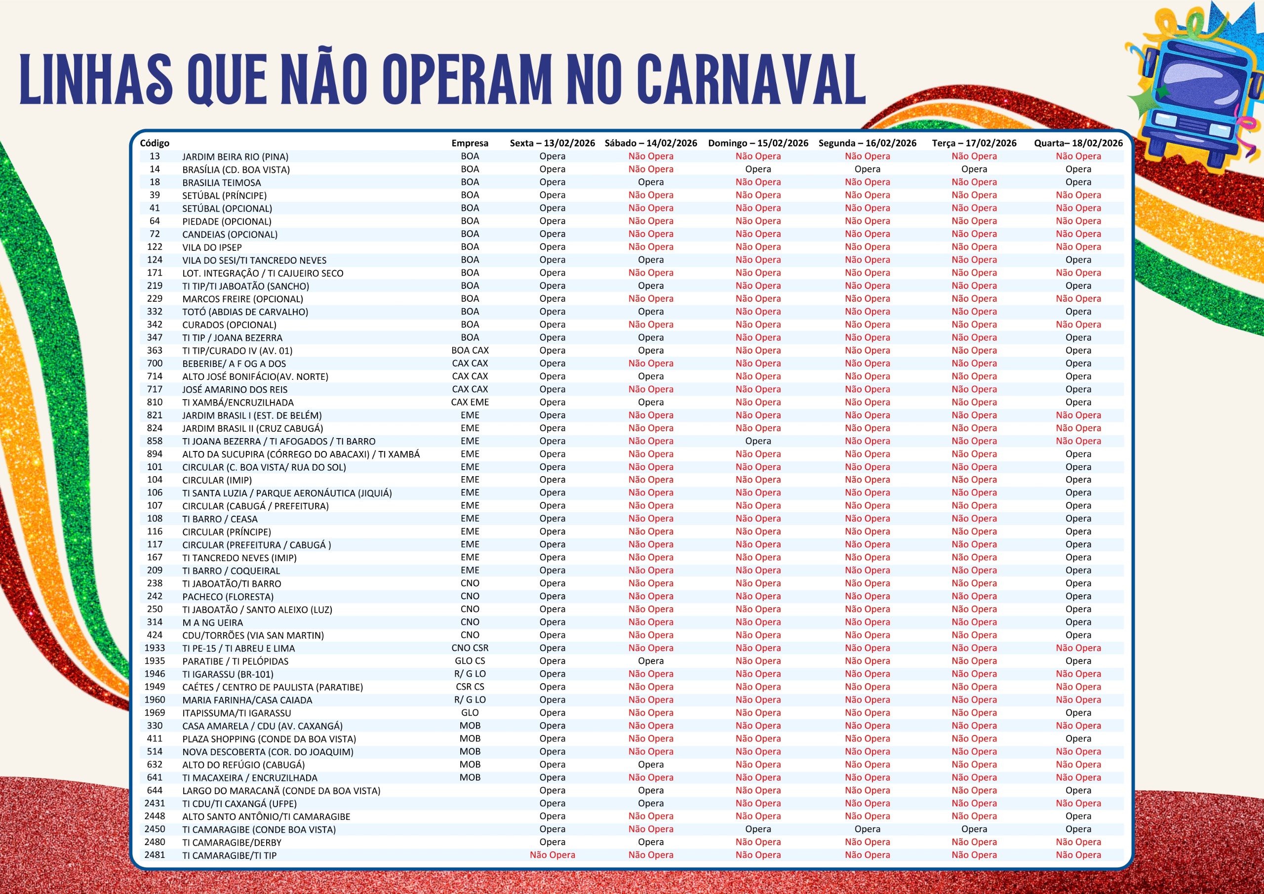 Segue abaixo  as linhas que não vão operar neste Carnaval: